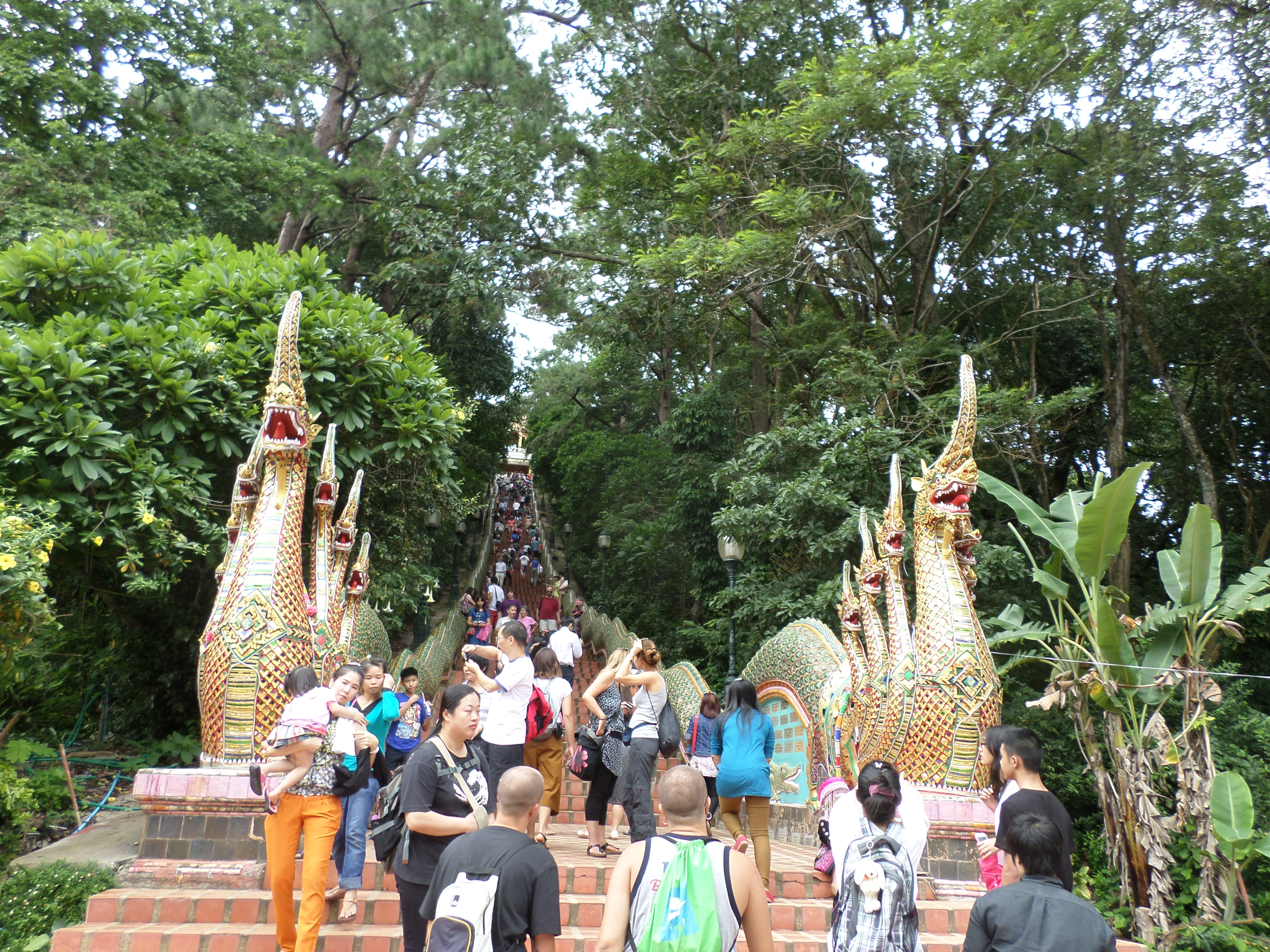 DOI SUTHEP (1675m): Pequeña montaña cercana en la que se encuentra el famoso templo con el mismo nombre. La leyenda cuenta que se construyó dónde murió un elefante blanco que llevaba las reliquias de un Buda. El templo merece la pena y la escalinata para subir la montaña nos recordó al Parc Güell de Gaudí. Sin embargo la aglomeración turística, las niñas pequeñas bailando exhaustas pidiendo dinero y las mil y una paradas de artesanía en la escalinata nos decepcionaron.
