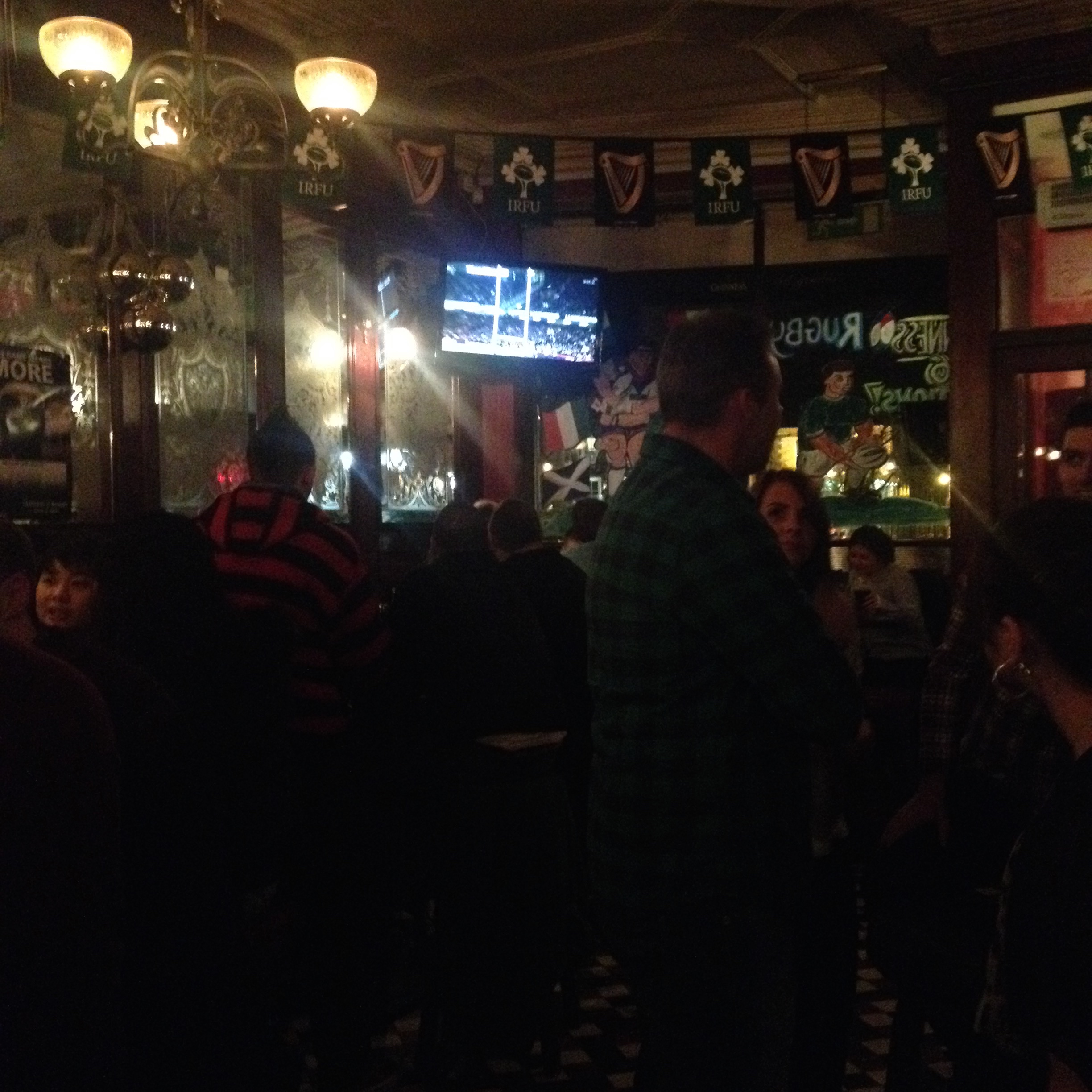 Salimos de allí y fuimos a un supermercado a comprar la cena y luego queríamos ver el partido de Rugby (Wales-England) a un pub llamado O’reilly’s. Decir que estaba a petar es poco, había un ambientazo increíble pero nos apetecía sentarnos y allí resultaba imposible. Acabamos en un céntrico pub llamado “Fitzgeralds”, nos tomamos un par de pintas mientras veíamos el partido. Yo veo poco deporte por la tele porque lo encuentro aburrido pero no es así en el caso del rugby. Lo encontré un deporte de mucho movimiento, fuerza y compañerismo. Además, verlo en un buen pub, rodeados de irlandeses y con una Guinness en la mano ayudó a hacerlo más entretenido. Luego de eso ya nos fuimos al albergue a cenar y luego a dormir.