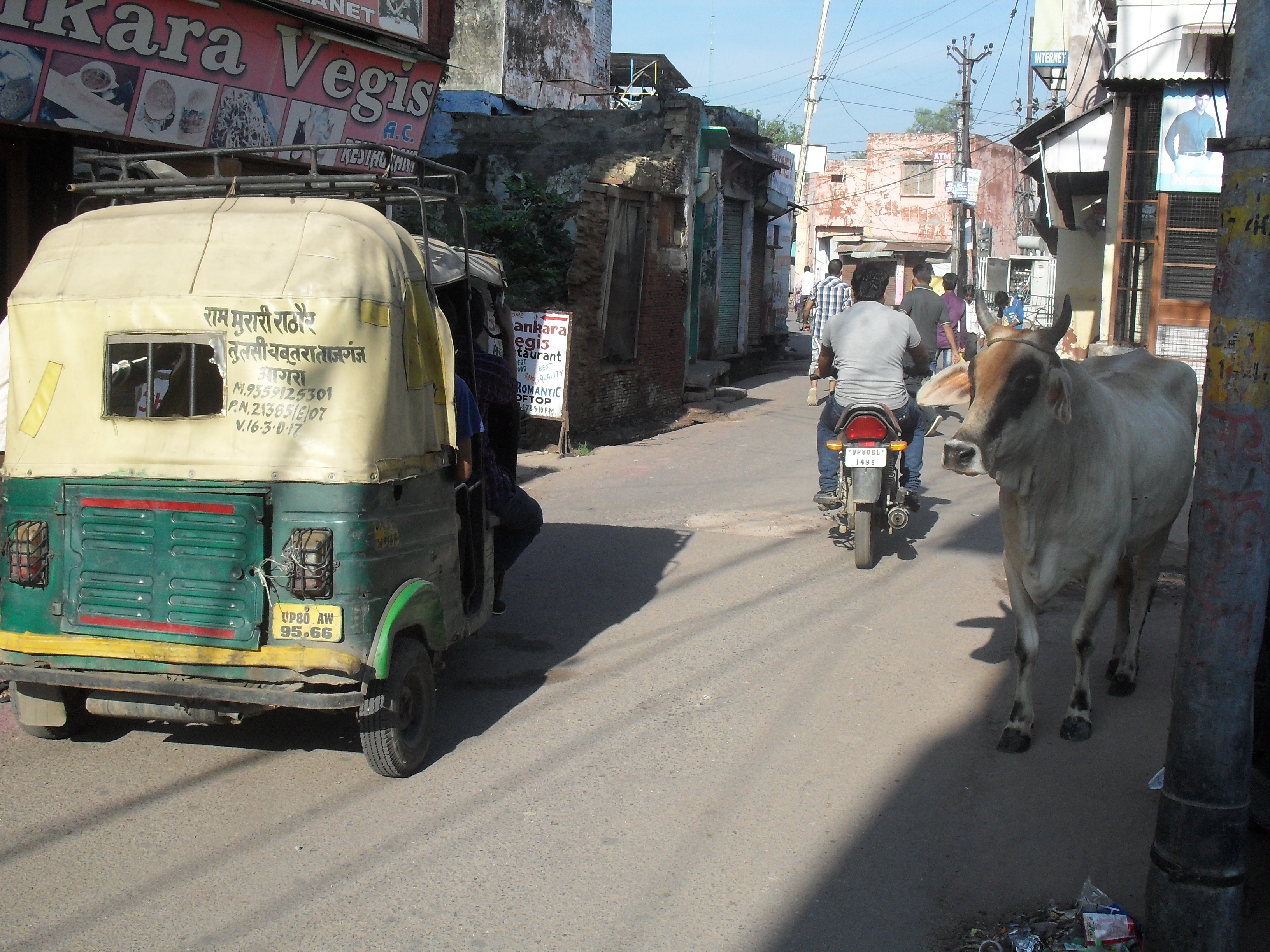 Llegamos a Agra. La ciudad está bastante hecha polvo. Allí vimos por primera vez un par de cosas muy recurrentes por toda India: un tráfico caótico y vacas libres por la calle. Nos alojamos en el muy recomendable (Saniya Palaca Inn) Tiene restaurante en la azotea, con vistas al Taj. Conocimos un chico de Seattle y decidimos ir juntos a ver el Taj Mahal al amanecer. Nos levantamos de madrugada, y caminamos por calles apenas sin luz mientras los perros nos ladraban y los vendedores nos acechaban. Salió el sol y abrieron las puertas.