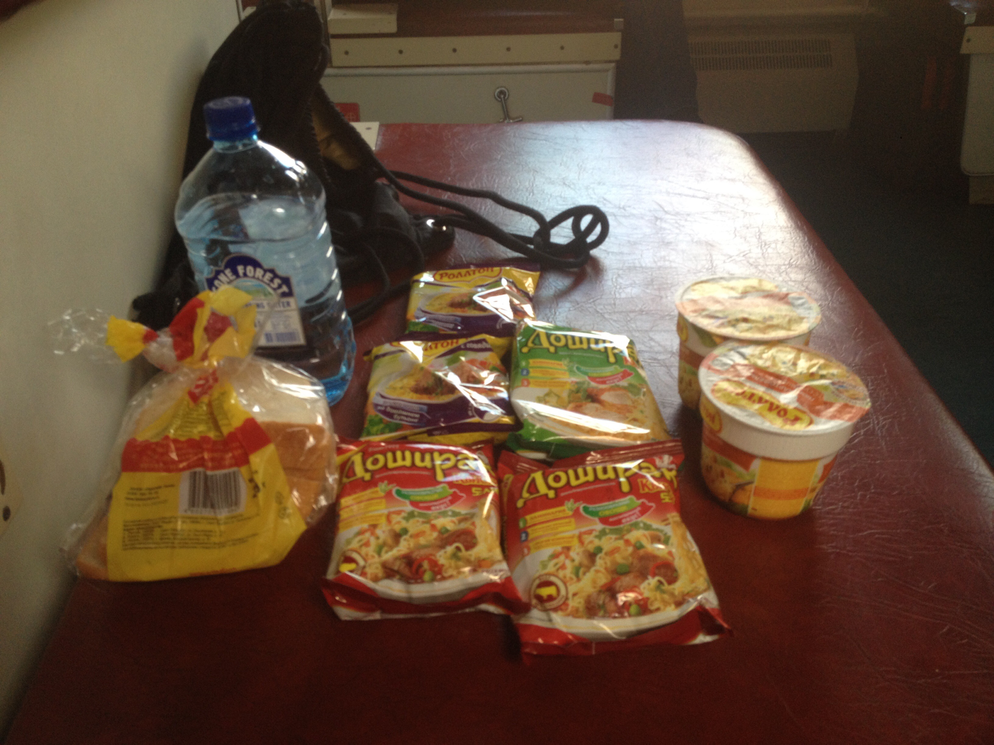 Si se quiere ahorrar dinero lo idóneo es traer una buena cantidad de comida aunque siempre es posible comer en el vagón-restaurante. Otra opción es apearse en las paradas largas y comprar comida a los vendedores ambulantes (venden pepinillos, patatas, pescados…) Yo hice corto en la compra aunque lo bueno es que los rusos suelen compartir su comida con los demás, doy fe de ello.