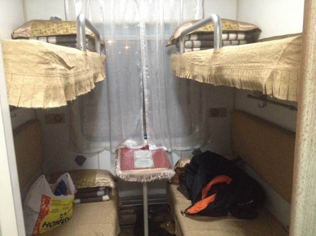 Segunda clase (llamada kupe). Compartimentos privados de cuatro camas en dos literas. Se viaja bien, se tiene cierta privacidad y cada cama tiene su propia luz.