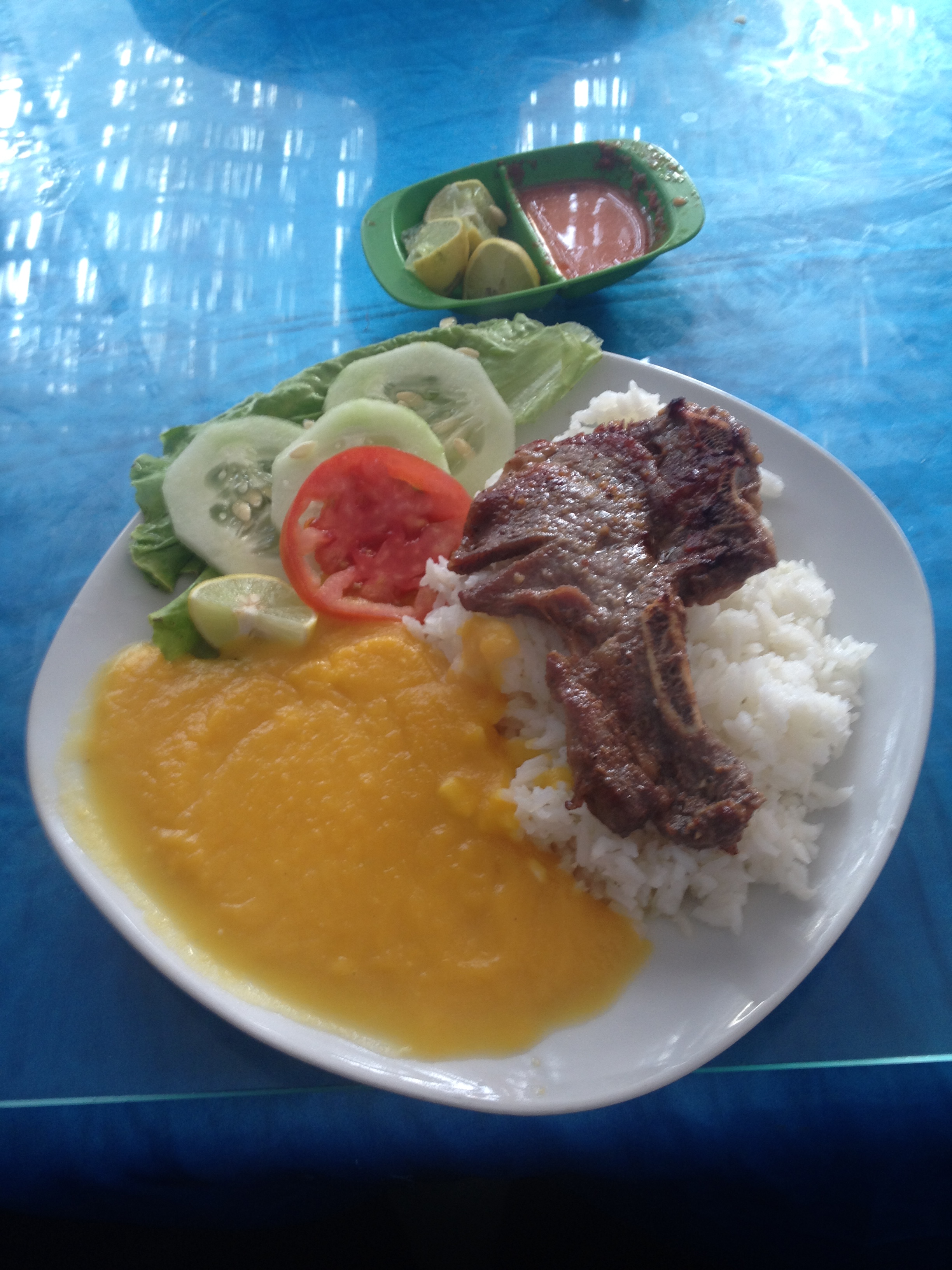 Menu de restaurante: arroz, carne, pepino, pure de calabaza (Paracas)